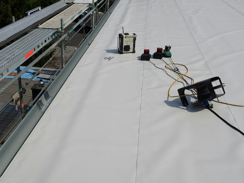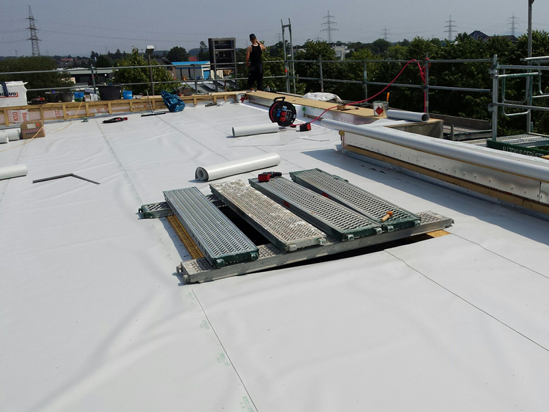| | Deutschland, Ettlingen, Tiefkühllager, Dachabdichtung mit TPO-Dachbahnen |