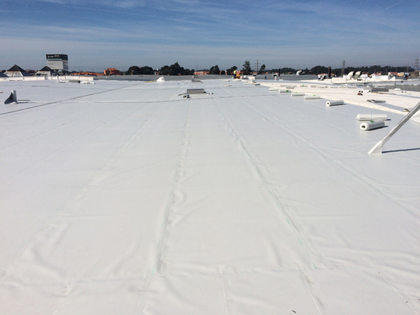 | | Deutschland, Berlin-Teltow, Mömax Möbelhaus, Dachabdichtung mit KÖSTER TPO-Dachbahnen, mechanisch befestigt |