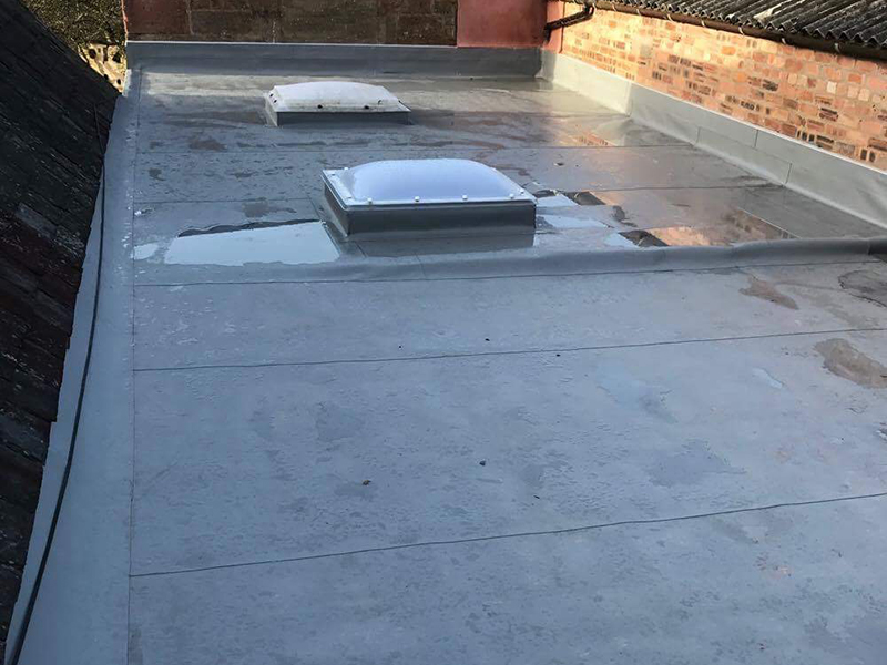 | | Deutschland, Bückeburg, Mehrfamilienhaus, Dachabdichtung mit selbstklebender TPO-Dachbahn |