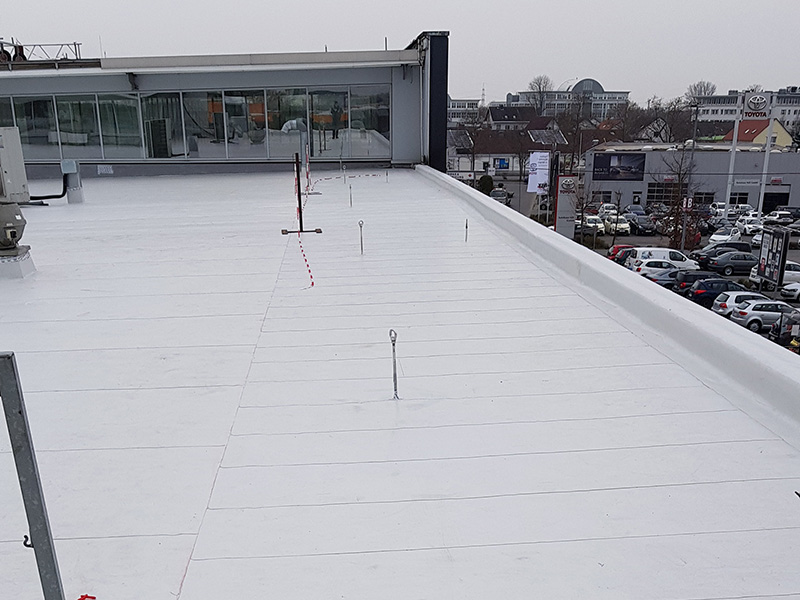 | | Deutschland, Berlin-Teltow, Mömax Möbelhaus, Dachabdichtung mit KÖSTER TPO-Dachbahnen, mechanisch befestigt |