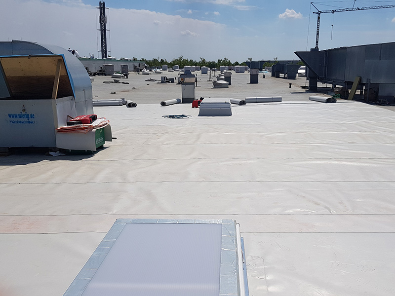 | | Deutschland, Ettlingen, Tiefkühllager, Dachabdichtung mit TPO-Dachbahnen |