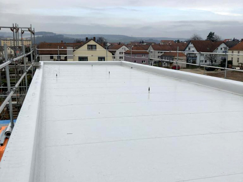 | | Deutschland, Bückeburg, Mehrfamilienhaus, Dachabdichtung mit selbstklebender TPO-Dachbahn |